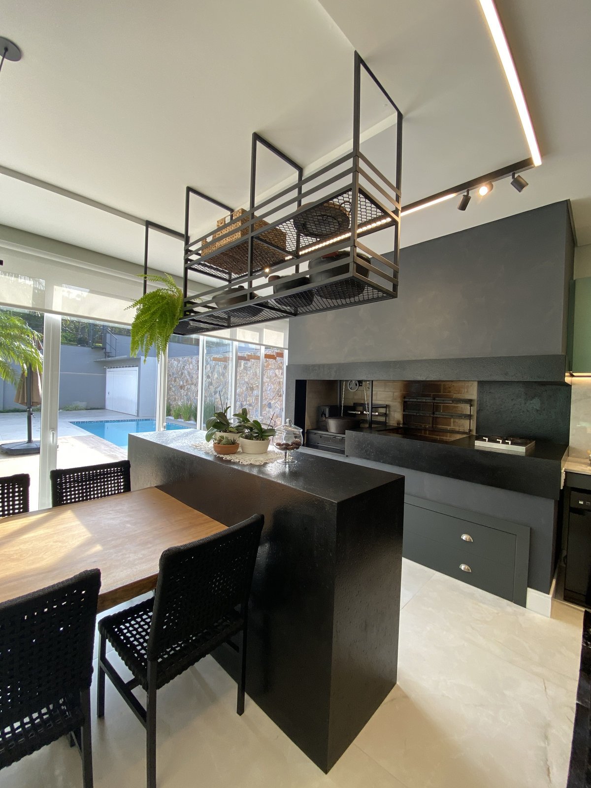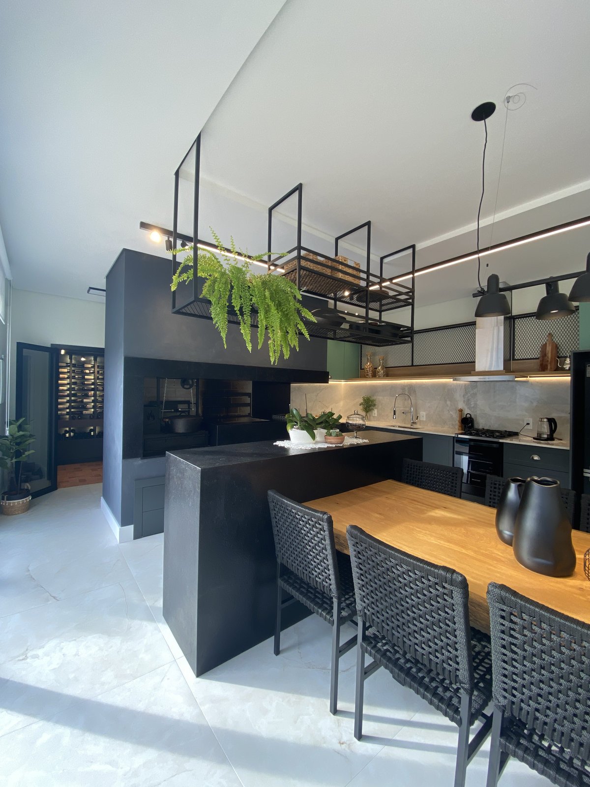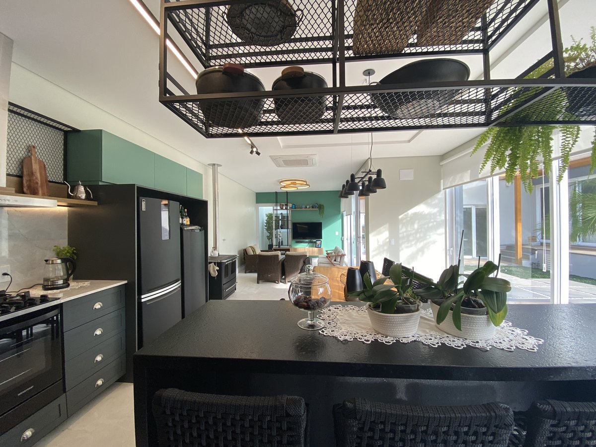 No interior, os espaços se conectam com naturalidade. A cozinha gourmet, o estar e o jantar compartilham o mesmo ambiente, pensado para reunir e acolher. Os tons de verde e preto, combinados à madeira e à iluminação pontual, criam uma atmosfera sofisticada e descontraída — ideal para encontros informais ou celebrações mais elaboradas.