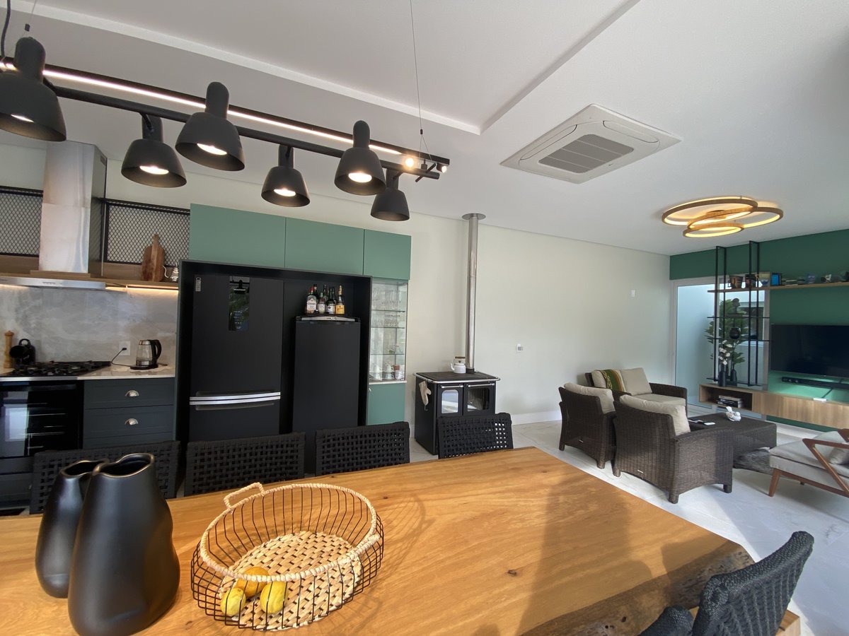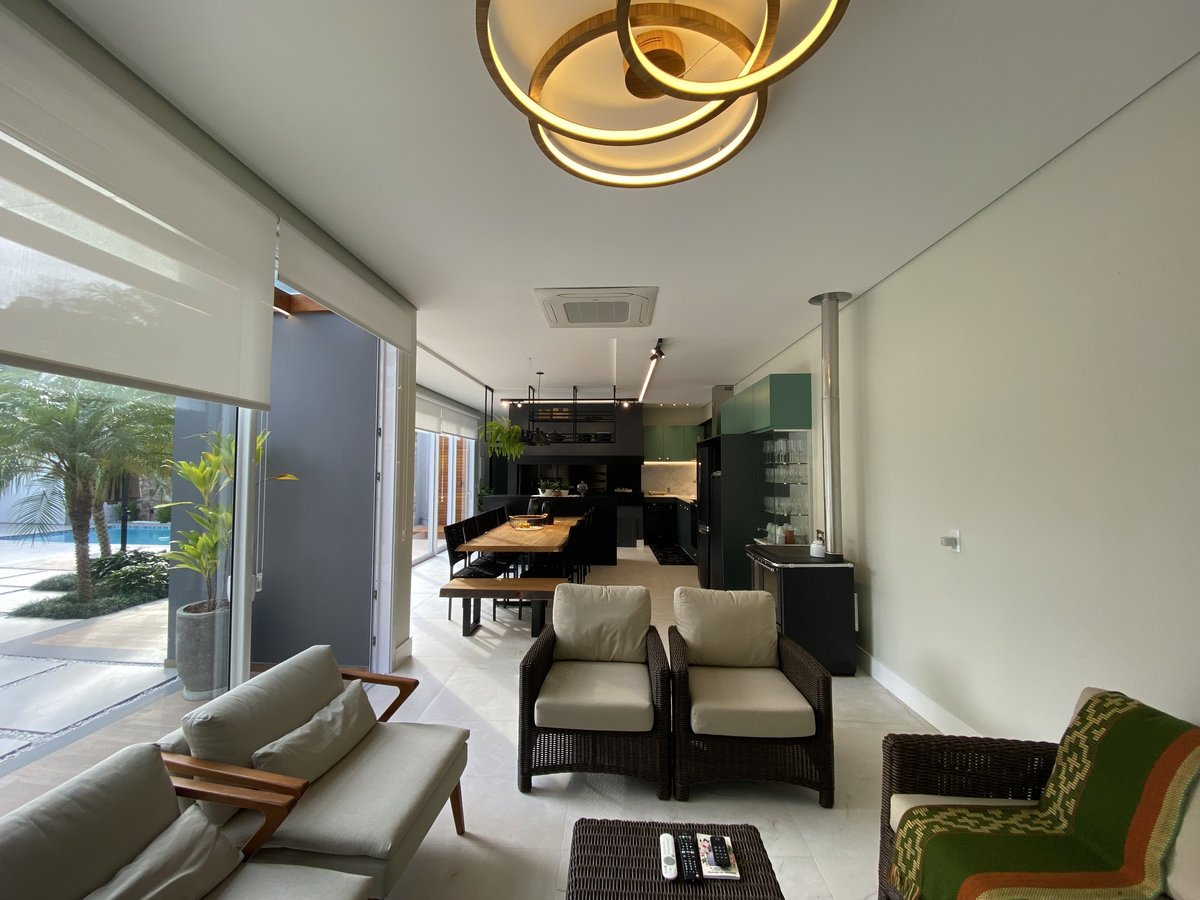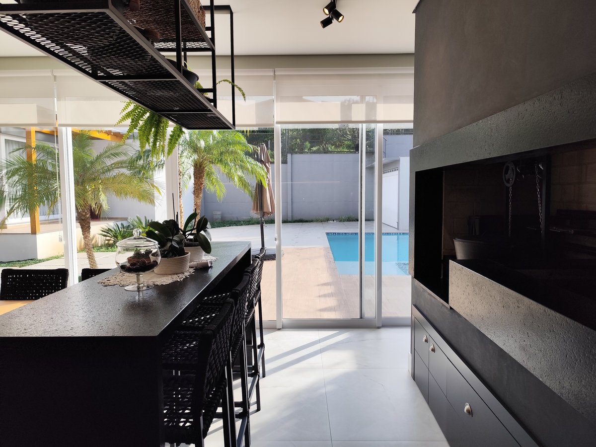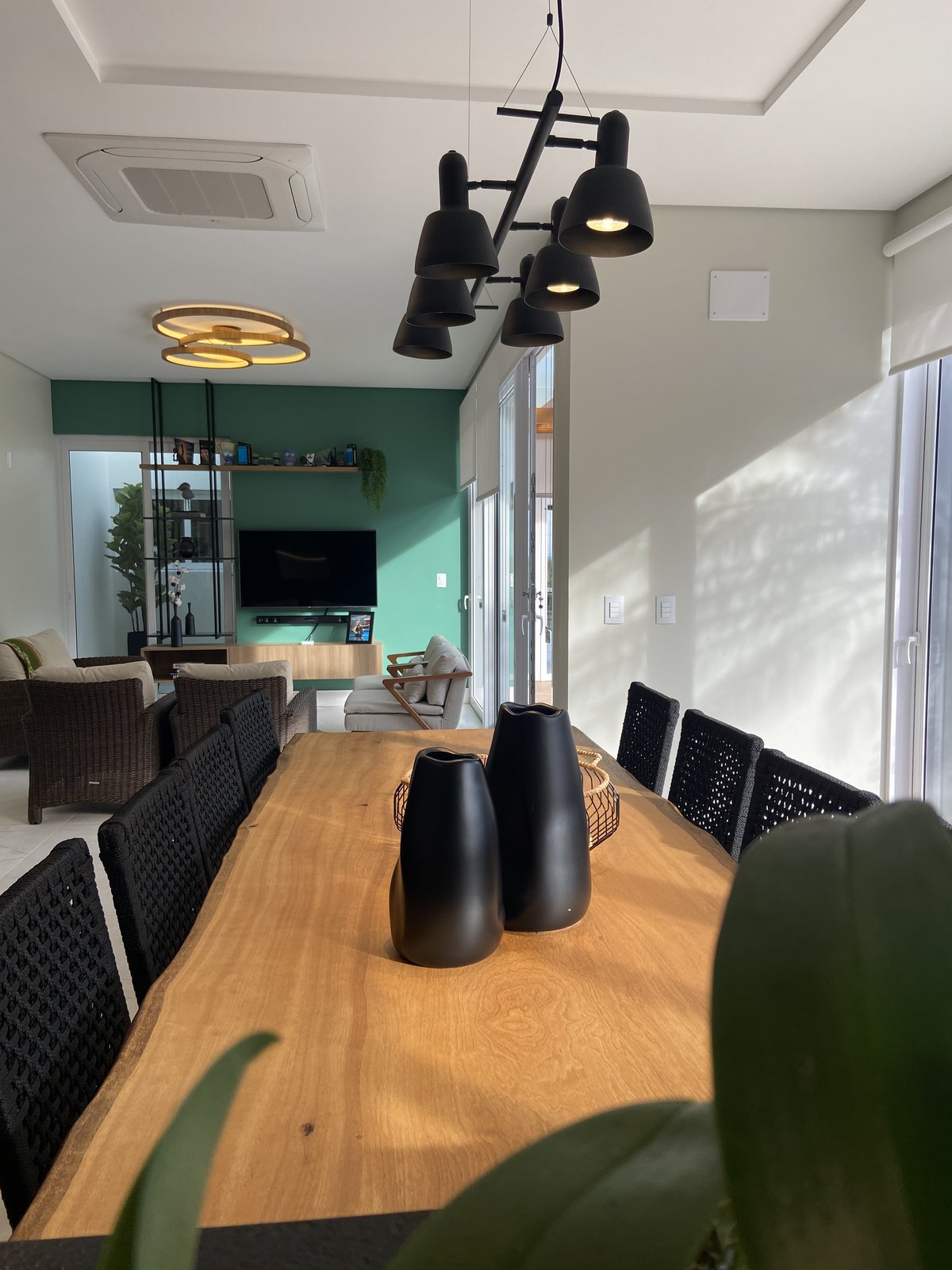 No interior, os espaços se conectam com naturalidade. A cozinha gourmet, o estar e o jantar compartilham o mesmo ambiente, pensado para reunir e acolher. Os tons de verde e preto, combinados à madeira e à iluminação pontual, criam uma atmosfera sofisticada e descontraída — ideal para encontros informais ou celebrações mais elaboradas.