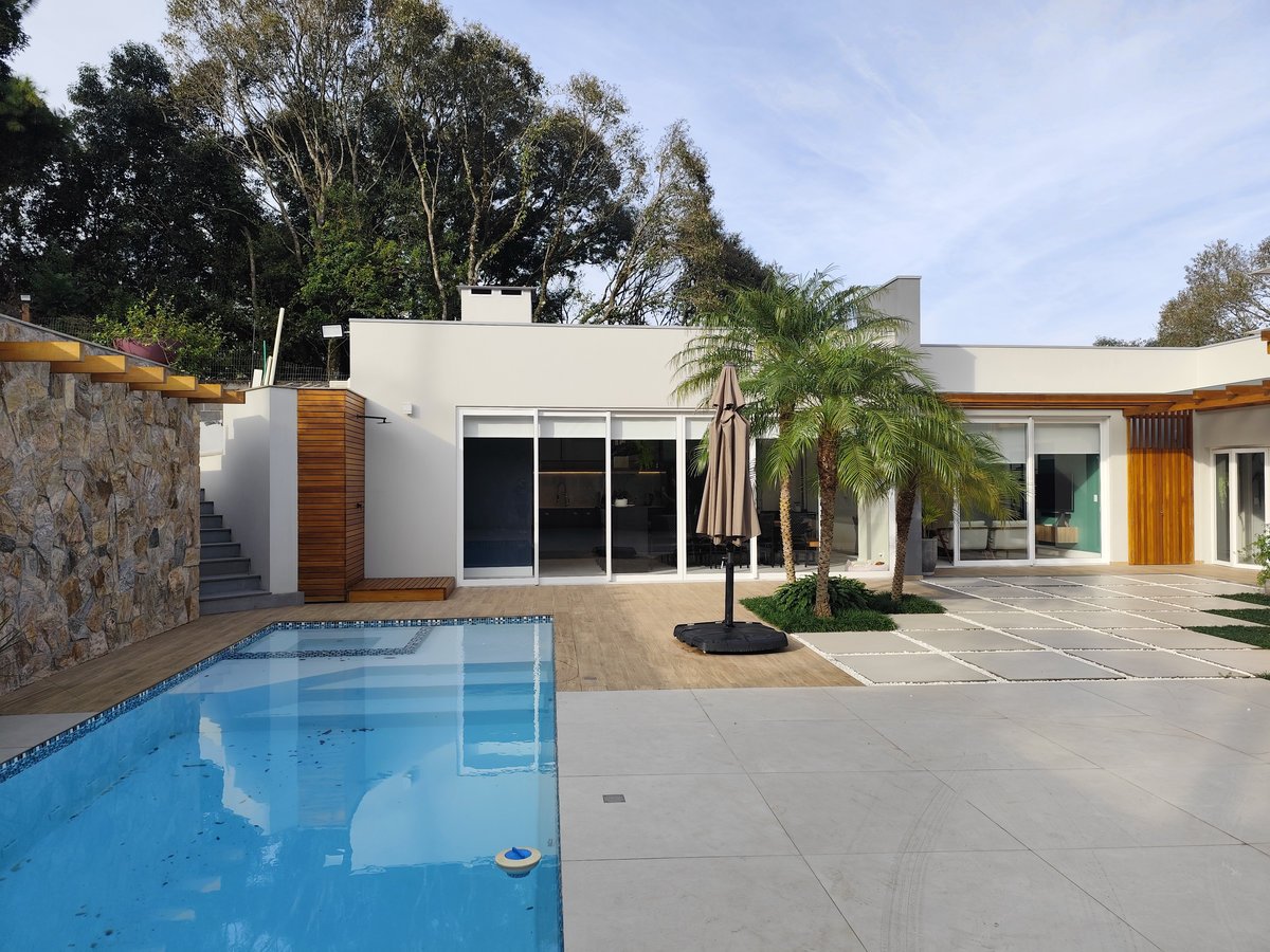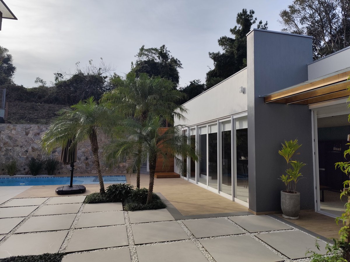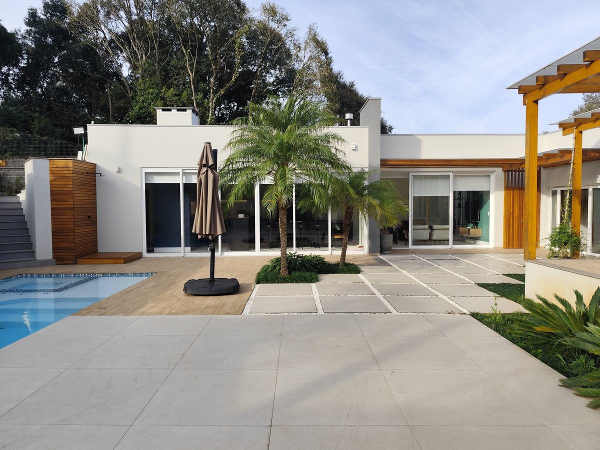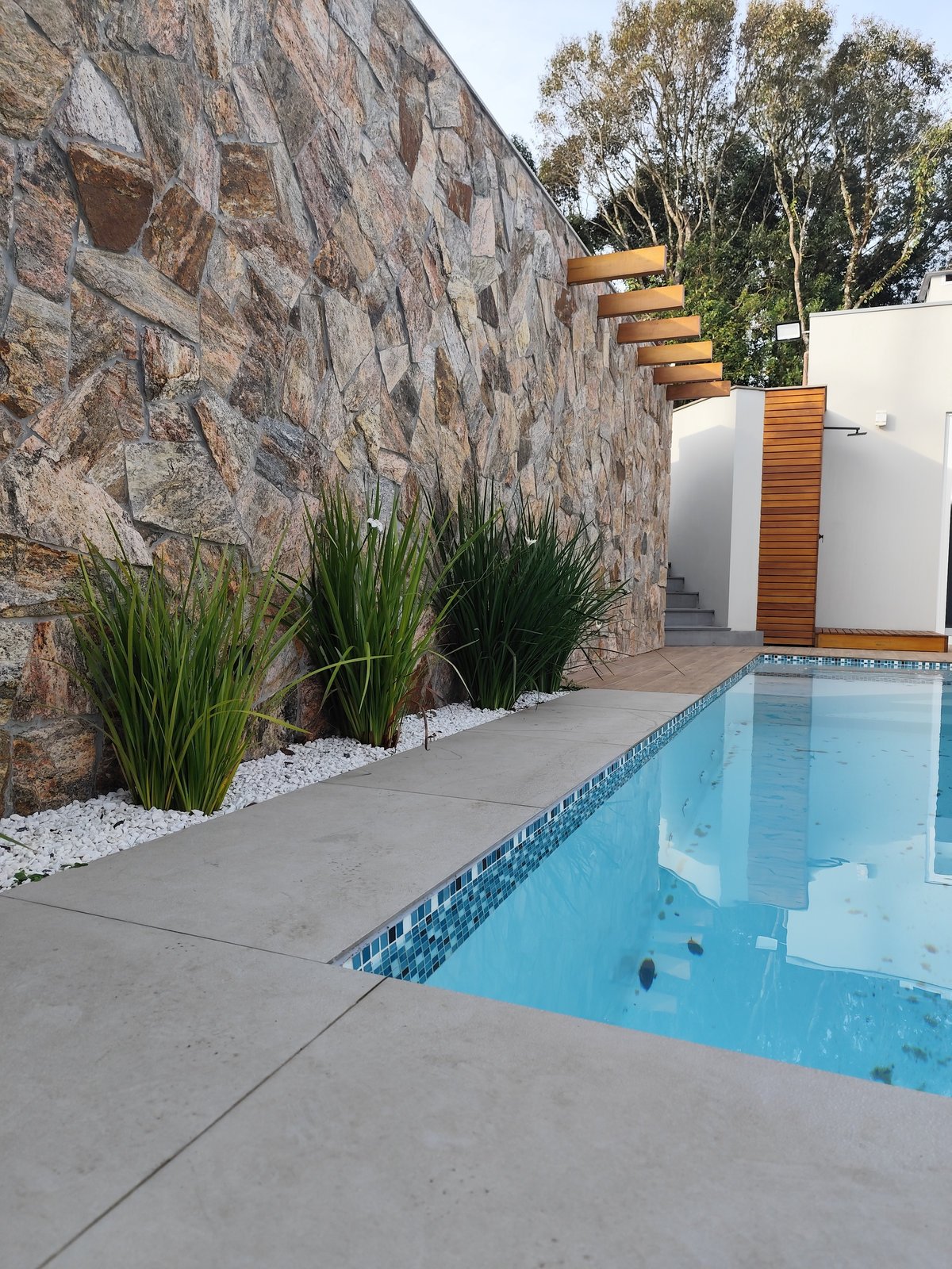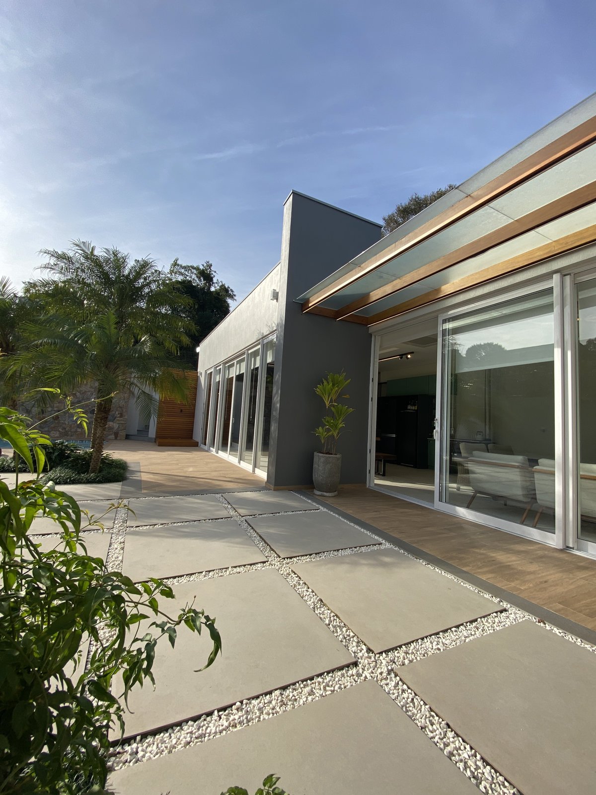 A nova volumetria, com linhas retas e materiais neutros, traz leveza e atualiza a linguagem da casa, respeitando o entorno. O desenho do pátio articula com equilíbrio os cheios e vazios: o piso modular com vegetação entre placas e a presença das palmeiras compõem uma transição suave entre o estar interno e a área da piscina. A parede em pedra natural atua como pano de fundo, agregando rusticidade e imponência ao conjunto.
