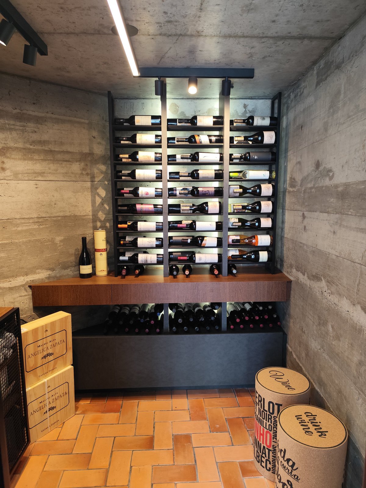 A adega, com sua materialidade bruta e iluminação precisa, funciona como um refúgio sensorial dentro do projeto. Pensada para conservar, sim — mas também para viver momentos. Um espaço de pausa, degustação e memórias.