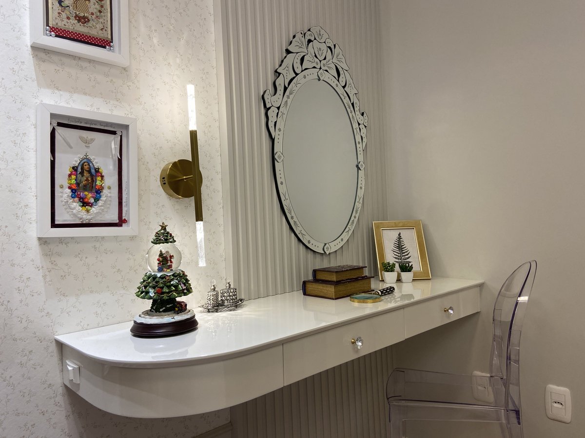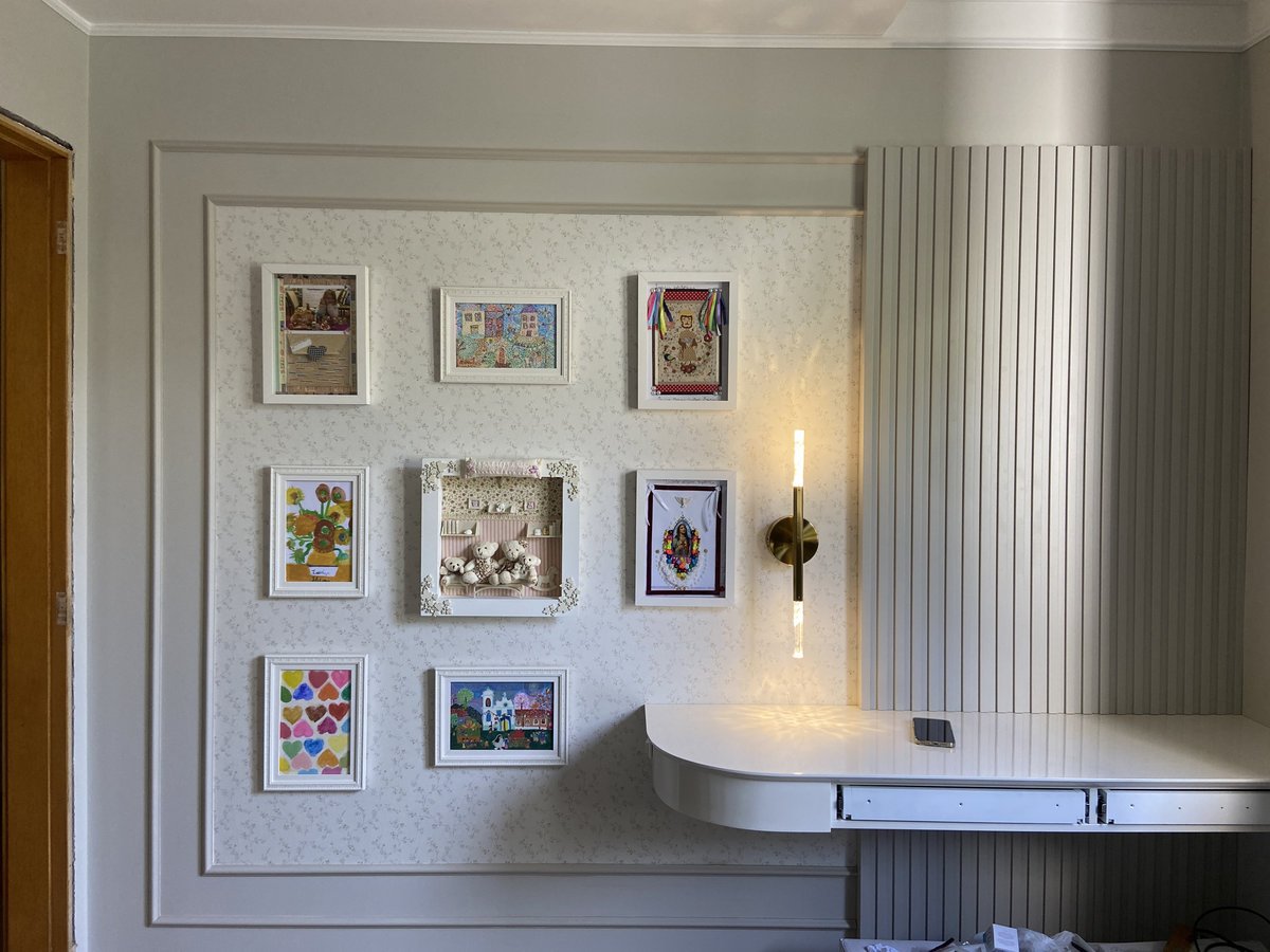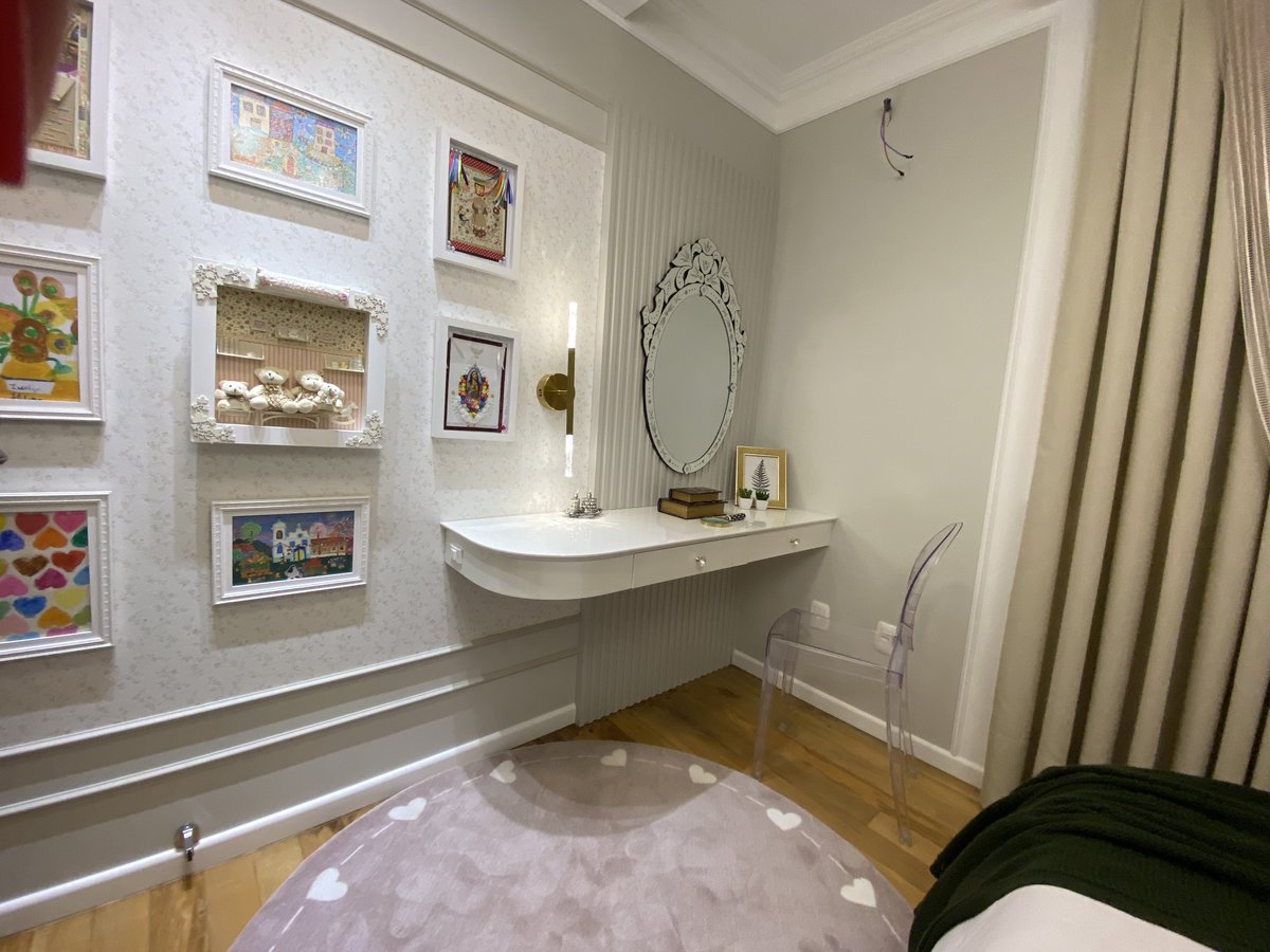 O destaque afetivo fica por conta da parede-galeria, que reúne criações da própria moradora — desenhos, bordados e colagens que traduzem sua sensibilidade e tornam o espaço único. Essa galeria não apenas decora — ela valoriza e dá voz à sensibilidade da infância, em um gesto que transforma o ambiente em território de expressão.