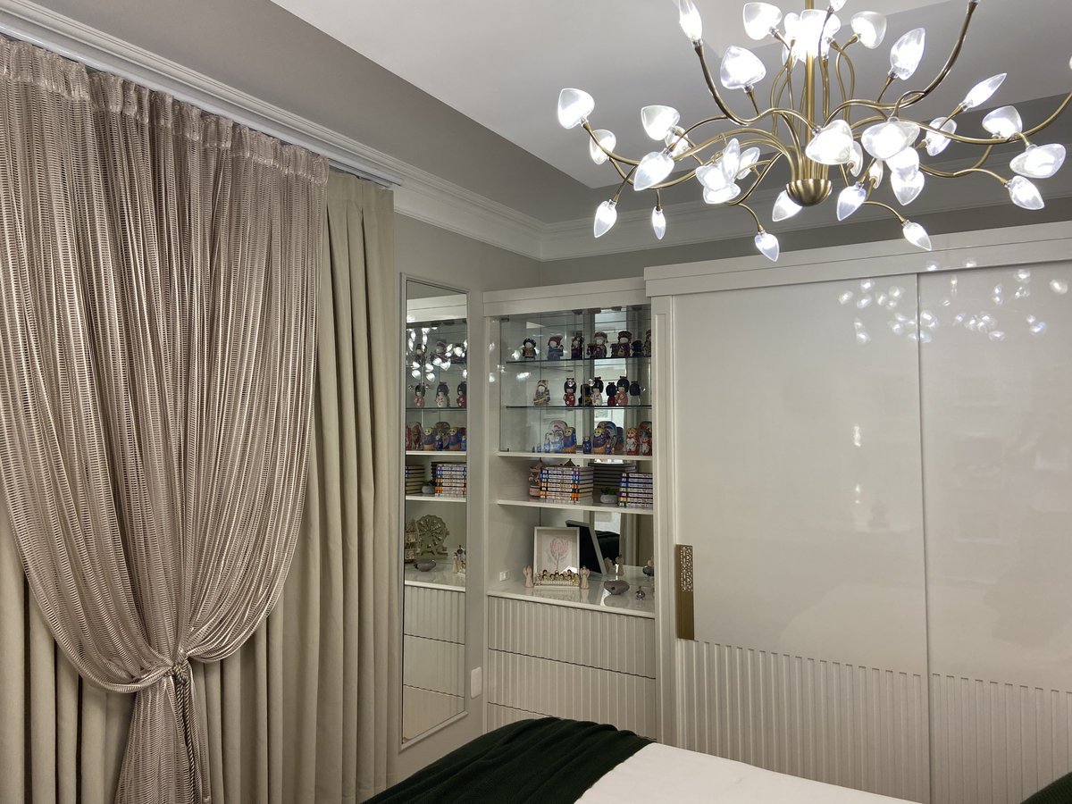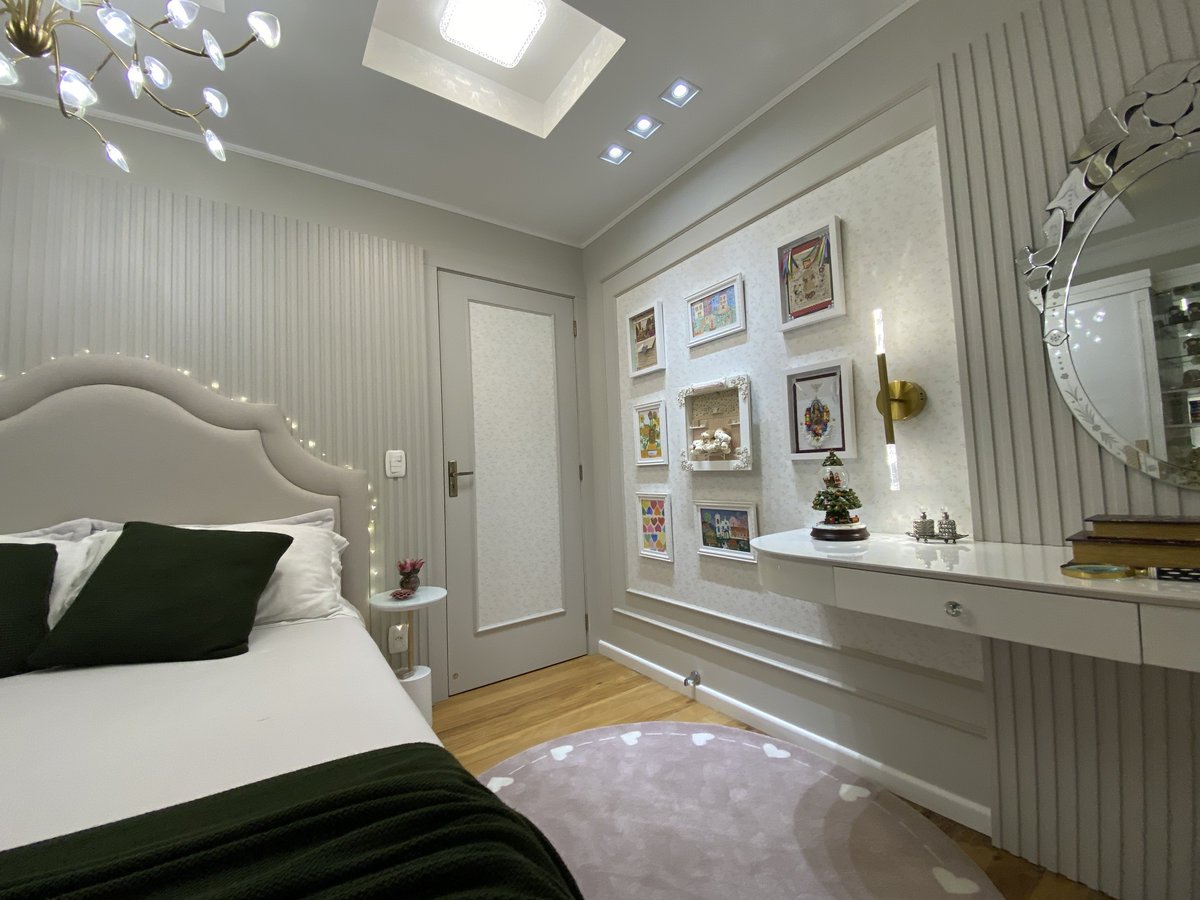 Projetado para uma menina de 9 anos, este quarto foi pensado com carinho para acolher a infância, sem limitar o tempo. A delicadeza está presente nos detalhes: a paleta clara, os painéis ripados, os pontos de luz dourados e a marcenaria com linhas suaves criam uma atmosfera leve, elegante e atemporal.