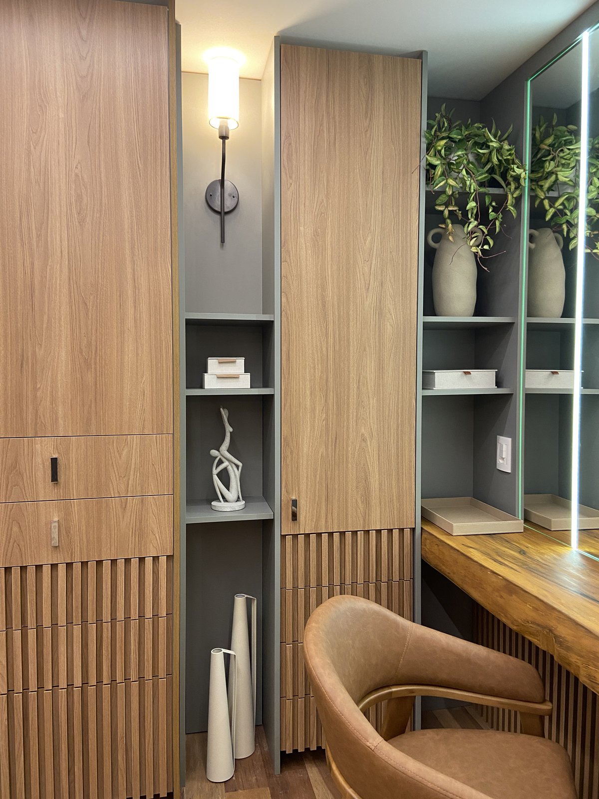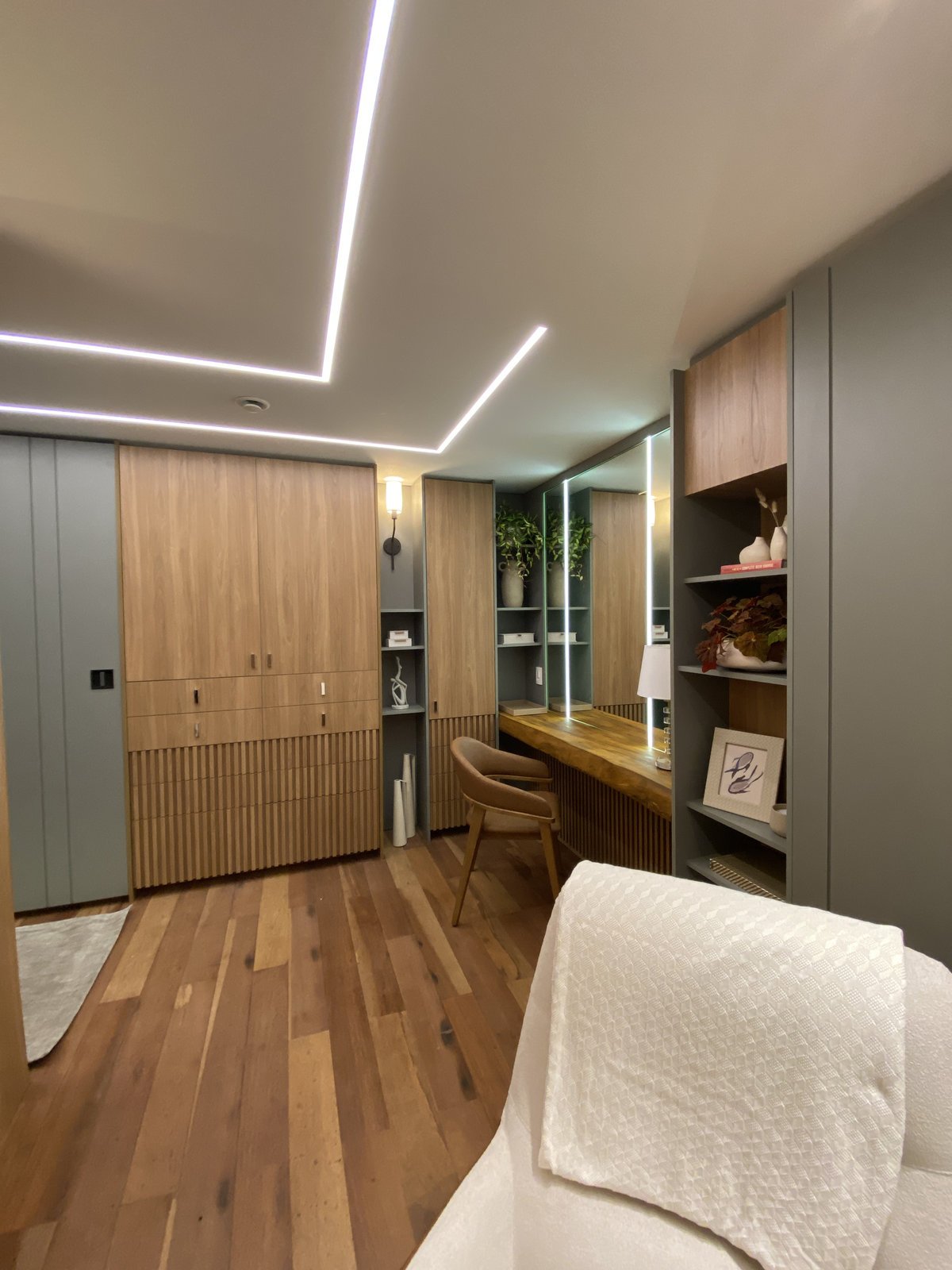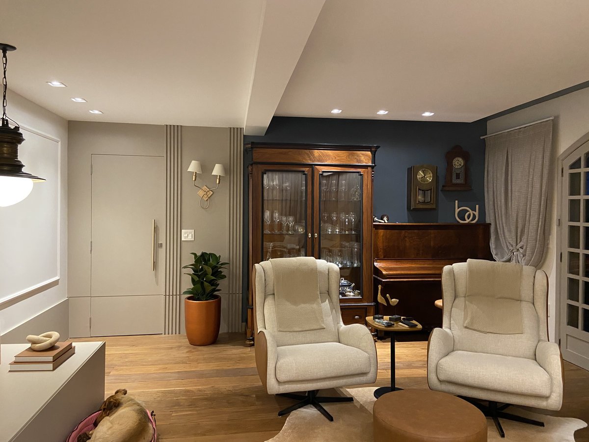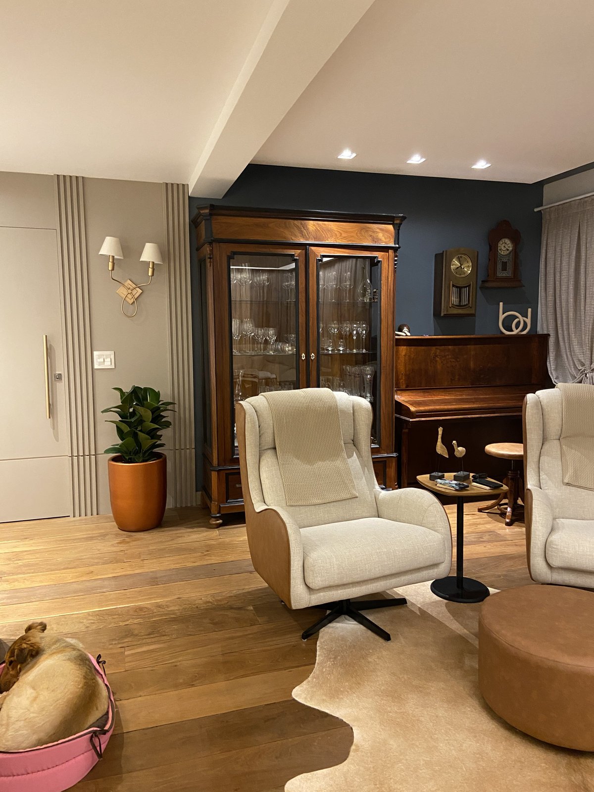 A intervenção valoriza o equilíbrio entre o que permanece e o que se transforma. Peças antigas, como o piano de madeira e os relógios de parede, encontram seu lugar com naturalidade entre novos volumes de marcenaria, mobiliário contemporâneo e soluções de iluminação embutida, criando um discurso coeso entre afeto e sofisticação. Cada escolha carrega intenção: o contraste entre texturas, a paleta de tons sóbrios e terrosos, a madeira presente em diferentes leituras, o uso de revestimentos que tocam o olhar e o tato.