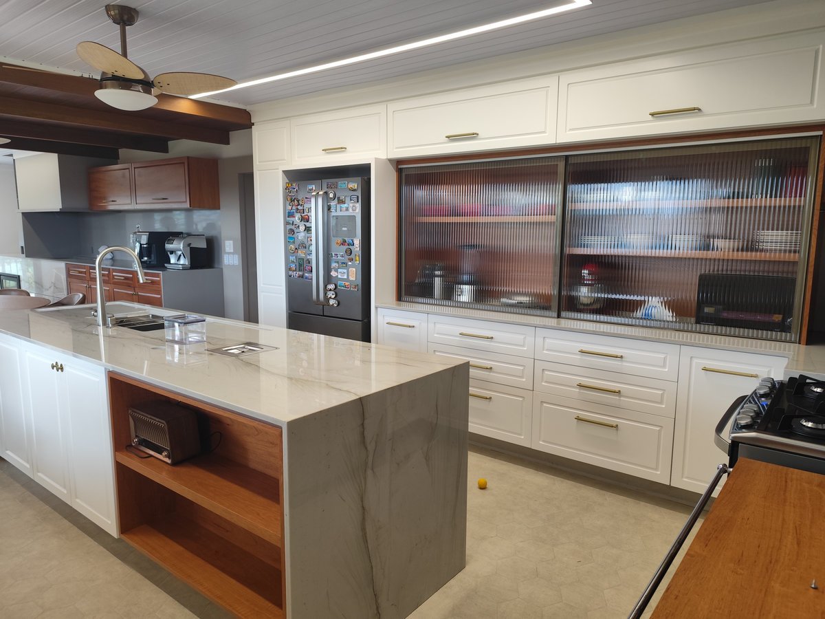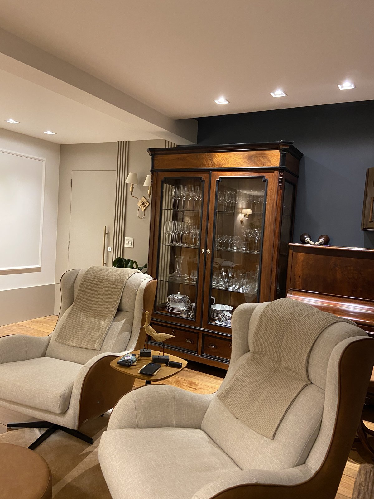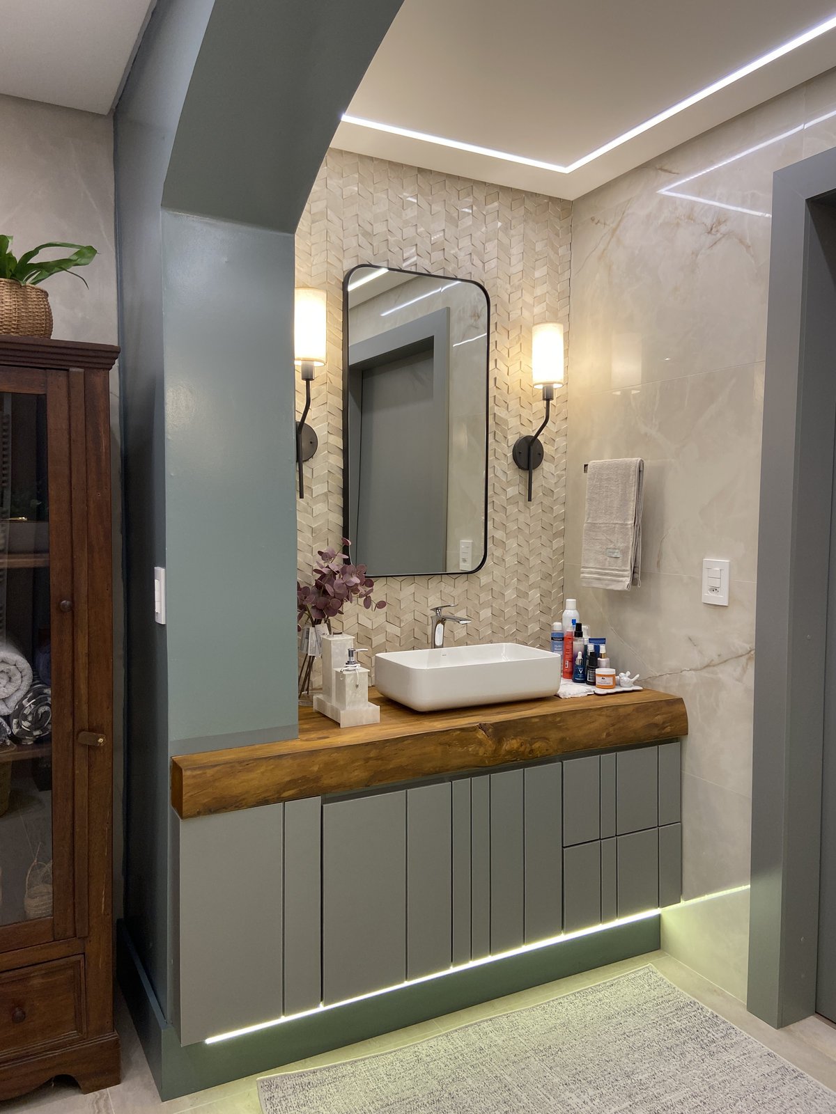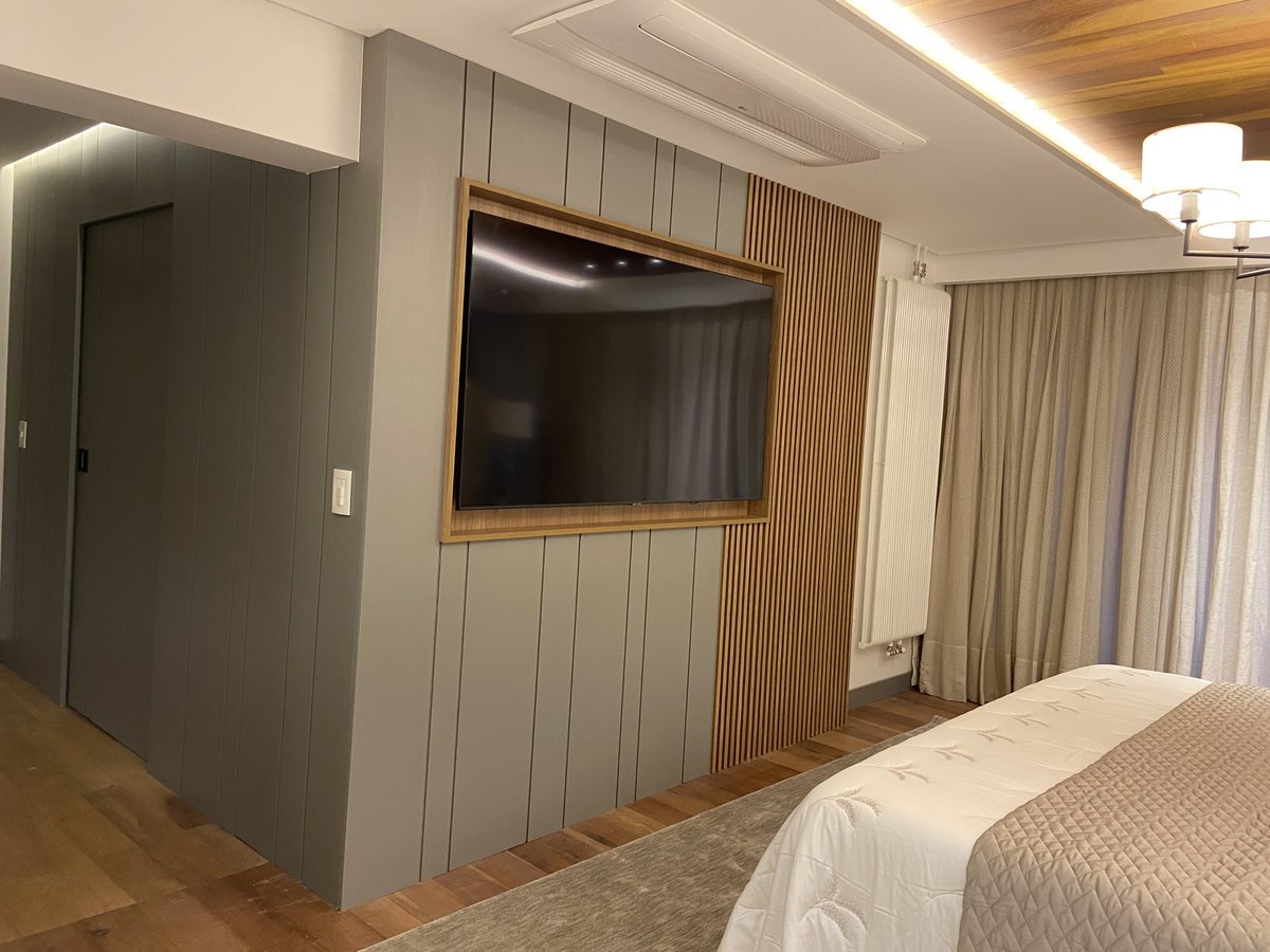 A intervenção valoriza o equilíbrio entre o que permanece e o que se transforma. Peças antigas, como o piano de madeira e os relógios de parede, encontram seu lugar com naturalidade entre novos volumes de marcenaria, mobiliário contemporâneo e soluções de iluminação embutida, criando um discurso coeso entre afeto e sofisticação. Cada escolha carrega intenção: o contraste entre texturas, a paleta de tons sóbrios e terrosos, a madeira presente em diferentes leituras, o uso de revestimentos que tocam o olhar e o tato.