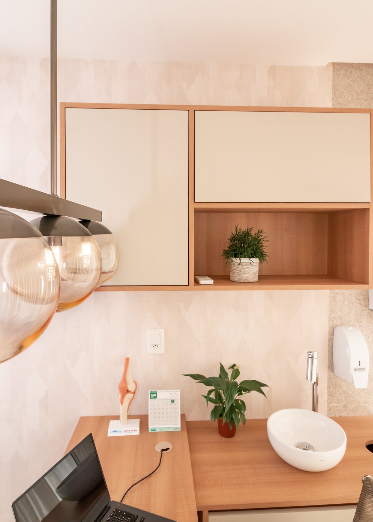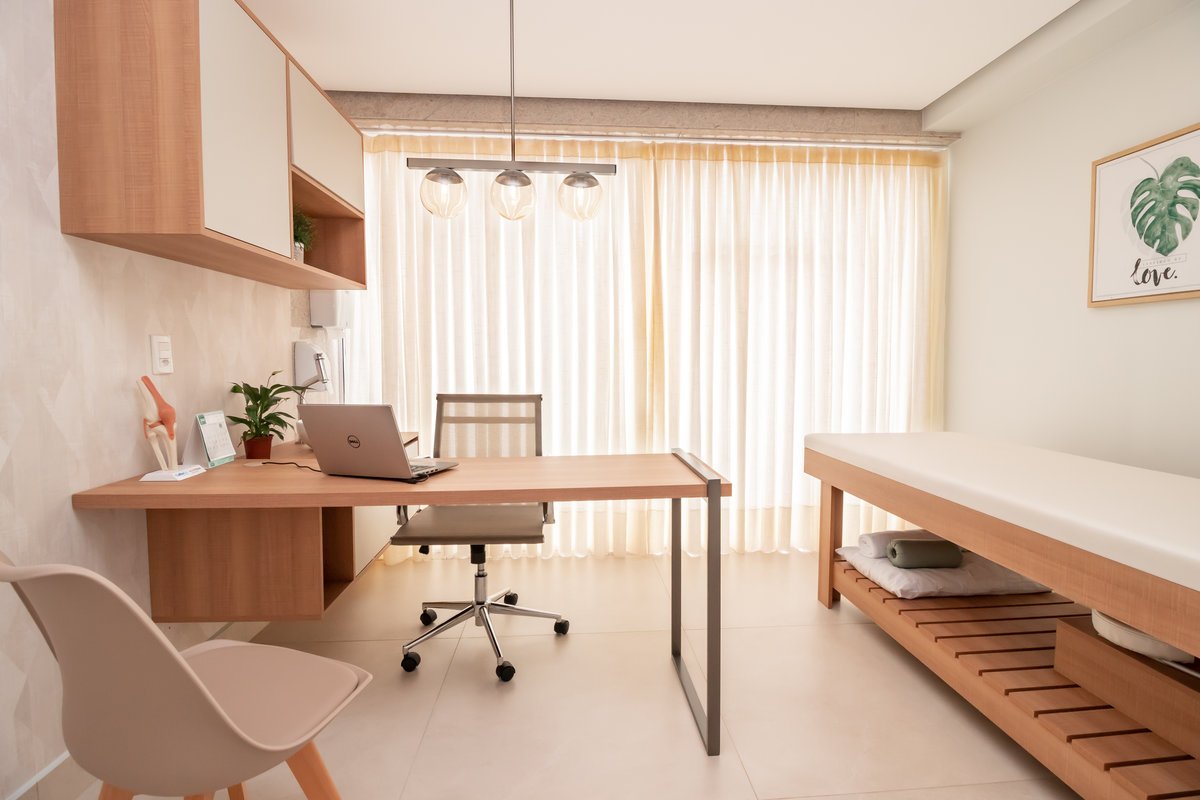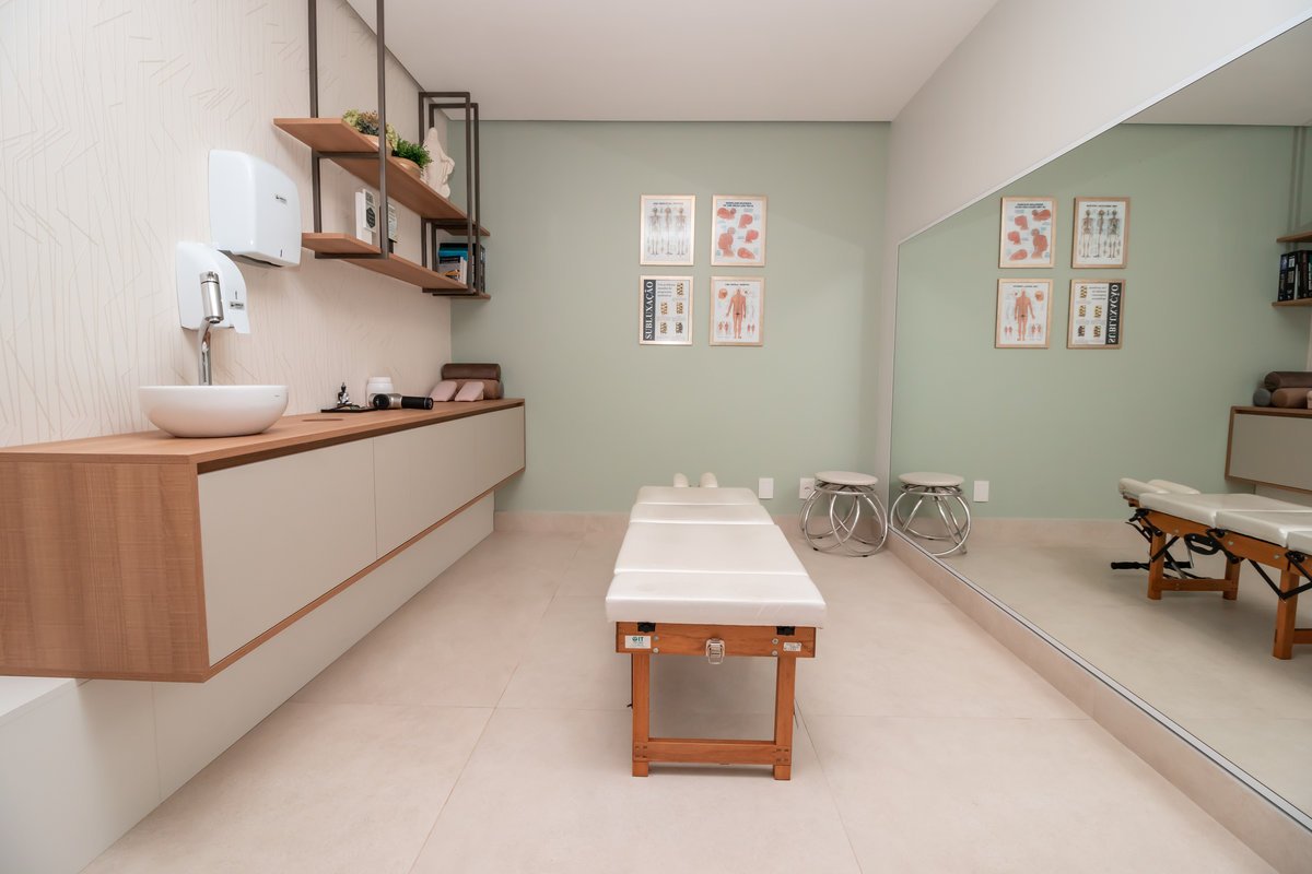 Cada detalhe foi cuidadosamente pensado para equilibrar estética e funcionalidade: desde a recepção revestida em mármore e painéis ripados — que já comunica leveza e sofisticação logo na chegada — até os espaços de atendimento individual, com mobiliário sob medida, iluminação suave e texturas que convidam ao relaxamento. Os consultórios e salas de terapia manual revelam um equilíbrio preciso entre técnica e suavidade, com superfícies limpas, organizadas e acolhedoras.