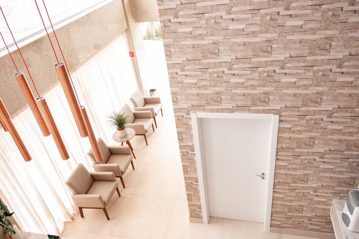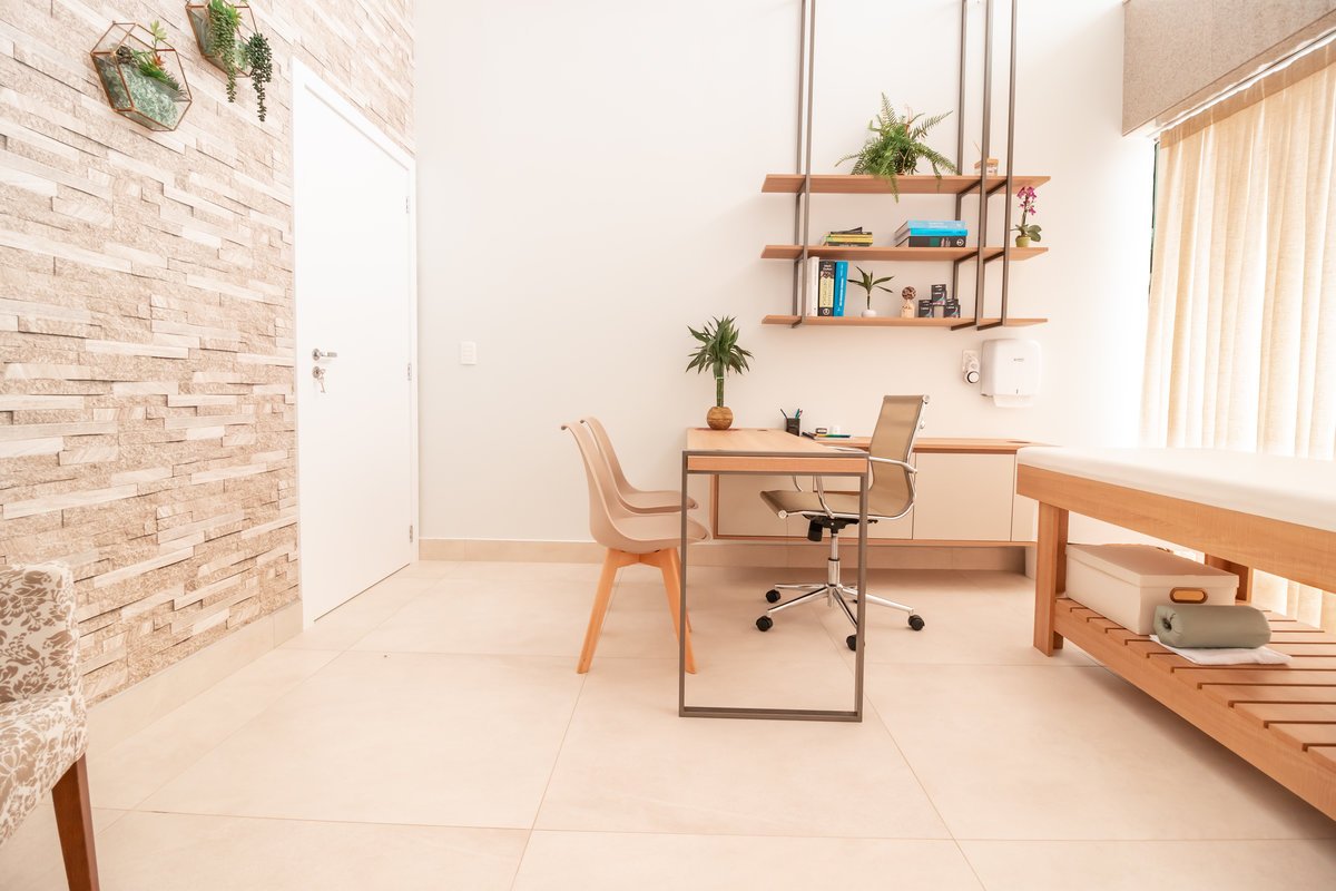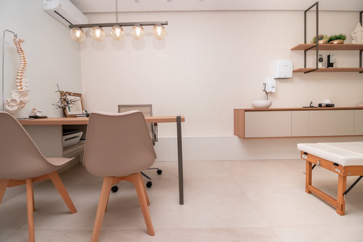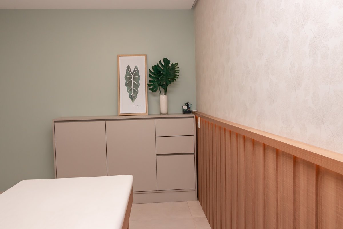 Cada detalhe foi cuidadosamente pensado para equilibrar estética e funcionalidade: desde a recepção revestida em mármore e painéis ripados — que já comunica leveza e sofisticação logo na chegada — até os espaços de atendimento individual, com mobiliário sob medida, iluminação suave e texturas que convidam ao relaxamento. Os consultórios e salas de terapia manual revelam um equilíbrio preciso entre técnica e suavidade, com superfícies limpas, organizadas e acolhedoras.