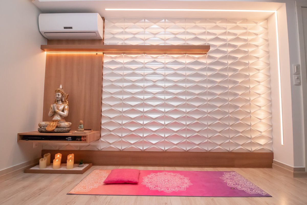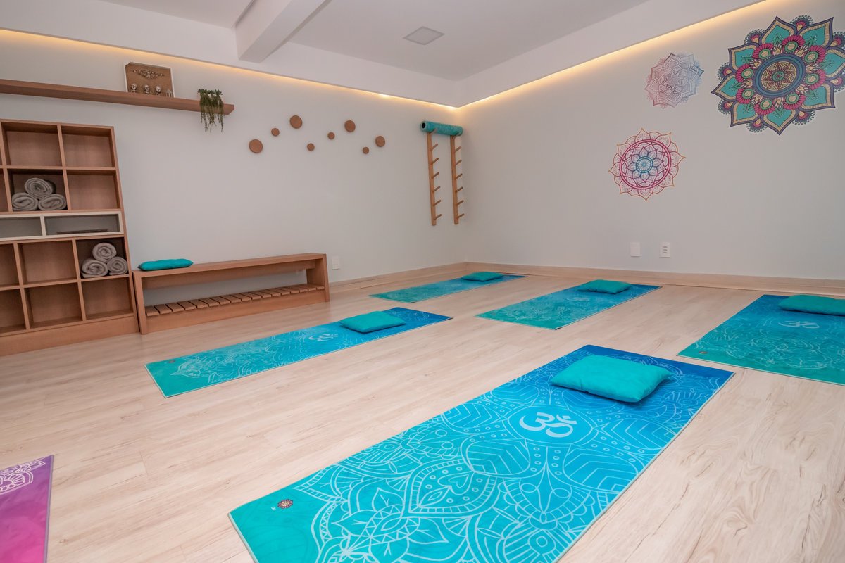 O estúdio de pilates, com pé-direito alto e grandes panos de vidro, valoriza a luz natural e amplia a percepção espacial, criando um ambiente arejado e vibrante, ideal para o movimento consciente. Já as salas dedicadas ao yoga e meditação foram desenhadas com atenção à introspecção: revestimentos texturizados, iluminação indireta e símbolos sutis reforçam o espírito de conexão e pausa.