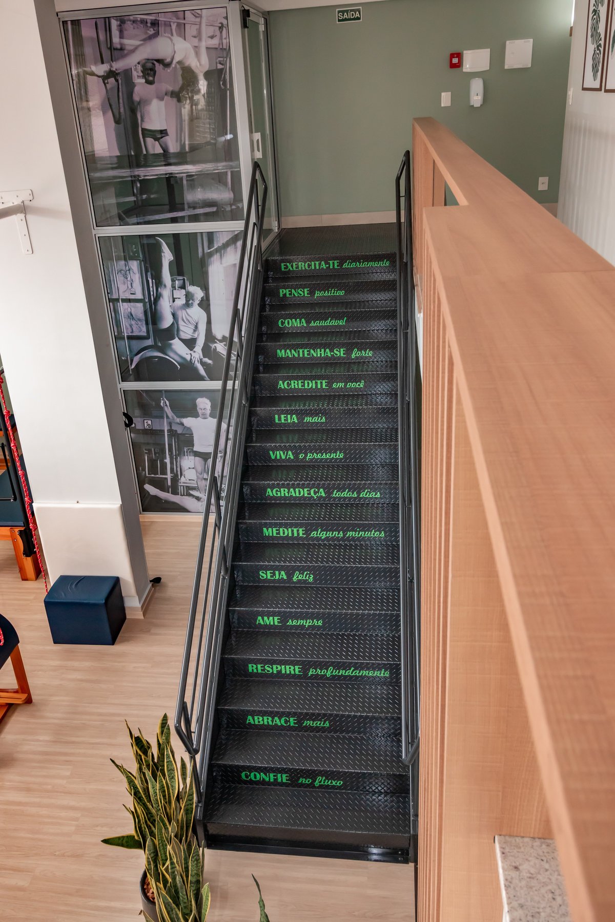 Há ainda elementos que vão além da função estética — como a escada com mensagens positivas em cada degrau — que refletem o compromisso do projeto com a inspiração diária e o bem-estar integral.