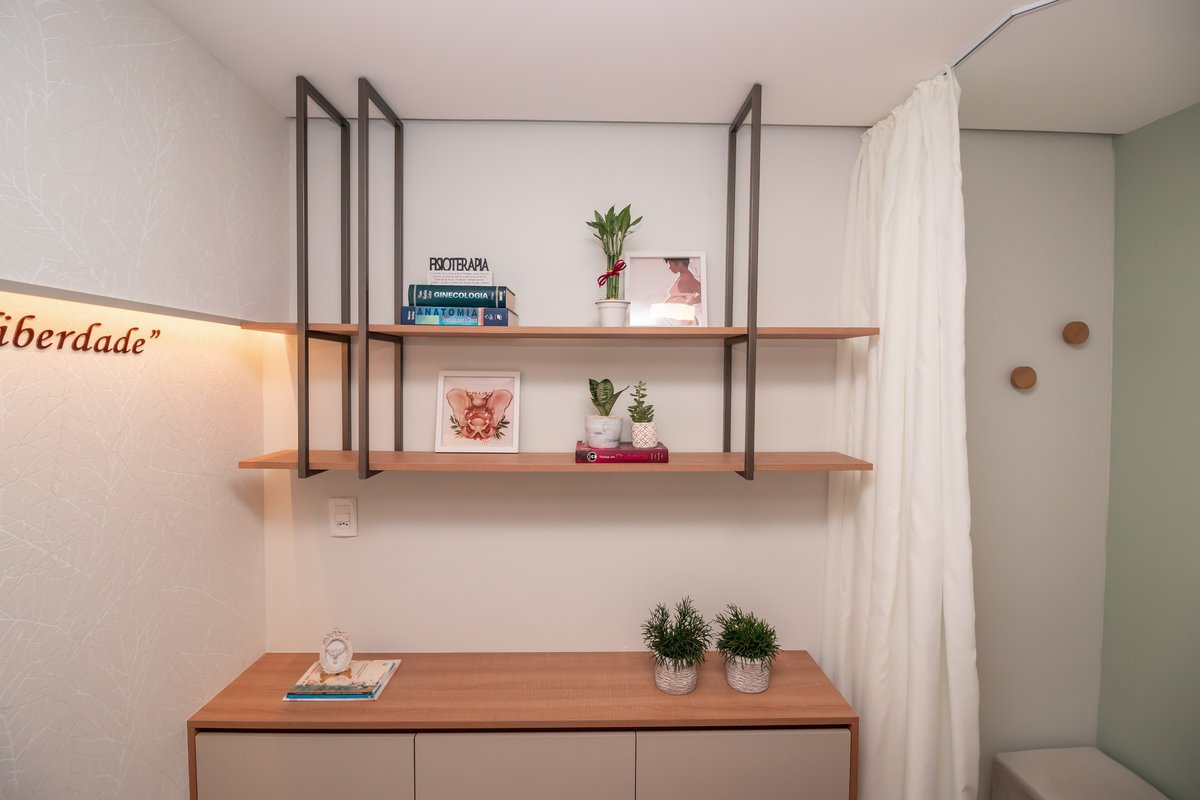 A paleta de cores suaves, em tons de verde sálvia, areia e madeira clara, percorre todos os ambientes, promovendo unidade visual e transmitindo serenidade. A madeira aparece como elemento afetivo e natural, trazendo calor às áreas de atendimento e contribuindo para a sensação de acolhimento.
